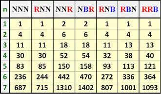 Denoting the total number of moves made by the optimal algorithms of the RBB and RRB puzzles as and , then referring to the solving algorithm listed above, it is easy to show that the following recurrence relation holds: