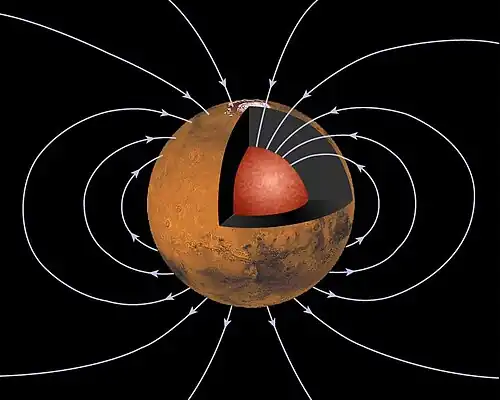 - ^ a b c d e f g Stevenson, David J. (July 2001). "Mars' core and magnetism". Nature. 412 (6843): 214–219. Bibcode:2001Natur.412..214S. doi:10.1038/35084155. ISSN 1476-4687. PMID 11449282. S2CID 4391025.