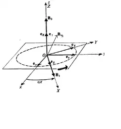 Spin angular momentum allows magnetic resonance phenomena to be explained via classical physics. When viewed from the reference frame attached to the rotating field, it seems that the magnetic dipole precesses around a net magnetic field , where is the unit vector along uniform magnetic field and is the same in the direction of rotating field and .