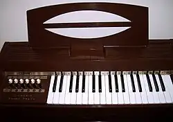 - 657: Tabletop Model, Three Octave, Six Major chord, Six Minor chord, Brown Plastic Case with faux wood - c. 1970s