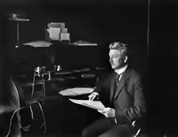 He joined the Norwegian Labour Party, and became a member of the central board in 1900. From 1901 to 1918 he was the party secretary. He lost out when "the new direction" became dominant in 1918.[1] "The new direction" had tried to replace him with Alfred Madsen at the national convention in 1915.[3] In 1921 he quit the central board to co-found a new party, the Social Democratic Labour Party of Norway. He chaired this party throughout its existence, from 1921 to 1927.[1] He took part at the founding congress of the Labour and Socialist International in 1923; the other Norwegian delegates were Arne Magnussen, Michael Puntervold and Olav Kringen.[4]