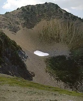 Maiden Peak is a 6,434-foot (1,961 m) summit located in Olympic National Park, in Clallam County of Washington state.[3] It is part of the Olympic Mountains and is situated near the eastern end of Hurricane Ridge within the Daniel J. Evans Wilderness. The nearest higher neighbor is Elk Mountain, 1.62 mi (2.61 km) to the west-southwest, and Blue Mountain is set 3.14 mi (5.05 km) to the east-northeast.[1] The peak is set approximately midway along the trail which connects Deer Park and Obstruction Point. Precipitation runoff from the south slope of the mountain drains into Grand Creek, whereas the north slope is drained by Maiden Creek, and all ultimately reaches the Strait of Juan de Fuca. Topographic relief is significant as the summit rises 3,000 feet (910 m) above Grand Creek in one mile. This landform's name was officially adopted in 1961 by the U.S. Board on Geographic Names.[3] One story has the origin of the name being derived from nearby Maiden Lake where young men and women camped around 1913, and the other being from a group of hikers that passed this area.[4]
