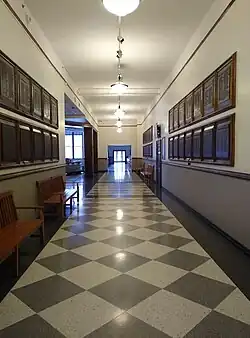 The Main Library's lobbies, circulation spaces, and second-floor reading room retain their elaborately detailed historic features. The reading room has 27 stained glass windows showing Renaissance printer's marks, and four Barry Faulkner murals decorate the walls of the central stairwell.[11] The functional spaces and secondary areas of the library interior, which were originally fitted more simply than the public spaces, still retain their original wood trim.[4]