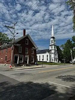 ![]() A 2016 view of Main Street across from its intersection with Bridge Street, looking west toward the North Yarmouth Academy campus and, beyond, Brickyard Hollow | |