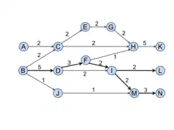 A link’s SPC is the number of times the link is traversed if one runs through all possible paths from all the sources to all the sinks. SPC is first proposed by Vladimir Batagelj.[9] SPC values for each link in a sample citation network is shown in Figure 1. The SPC value for the link (B, D) is 5 because five paths (B-D-F-H-K, B-D-F-I-L, B-D-F-I-M-N, B-D-I-L, and B-D-I-M-N) traverse through it.