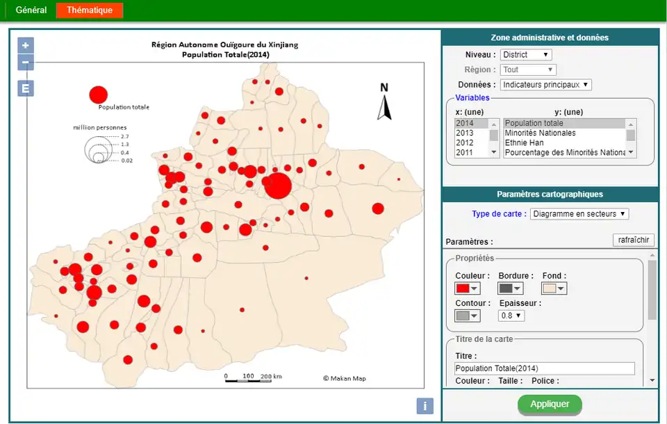The Makan Map is an online interactive atlas of the Xinjiang Uyghur Autonomous Region of China.[1][2][3][4] This region covers an area of 1,664,897 km2, or 16% of China's territory. It allows to visualize geographic, administrative and socio-economic baseline data, to carry out statistical analysis and to create thematic maps for this region.[5] The Makan Map is the first multi-language atlas of the Xinjiang.[6] It has been created in four languages: Uyghur, Chinese, French and English. The current version is the second version of the Makan Map.[1] Development is ongoing for future releases.[6]