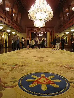 An elaborate ceiling was installed in the 1930s, carved by noted sculptor Isabelo Tampingco who depicted vases of flowers against a lattice background. Large mirrors, gilt sofas and armchairs, and Chinese bronze pedestals holding plant and flower arrangements decorate the Hall. The Tampingco woodwork was curved and in some eyes gave the room a coffin shape. This is supposedly why in the 1979 renovation, the Tampingcos were replaced with two facing balconies.[16]