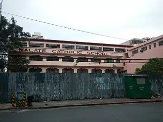 "There's a school by the Church of Malate That we honor with heart sincere; It's our own school and none could be better, To our mem'ry t'will always be dear, For the truths that we learn in Malate Will guide us forever more, Loyal to God and our country When life's long pilgrimage is o'er When the days of our schooling is over, And the battle of life must be won, Our strength will be found in the teaching We learned in Malate while young Undaunted by fears and temptations, Steadfast and virtue our rule "True to my Faith" is our Motto, The bond of Malate Catholic School."[1]