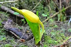 Malcolm Knapp Research Forest is categorized in the Coast Western Hemlock Biogeoclimatic zone, with the lower portion of the forest in the dry maritime subzone and the upper portion in the very wet maritime subzone. It has a vast collection of trees, plants and animals including Douglas fir, western red cedar, western hemlock and amabilis fir trees. The forest still has some patches of intact old growth forest that is over 400 years old. Some other trees and plants found in the forest are bigleaf maple, vine maple, skunk cabbage (yellow flower pictured beside), Oregon grape, salmonberry, and many ferns like sword fern and spiny wood fern.
