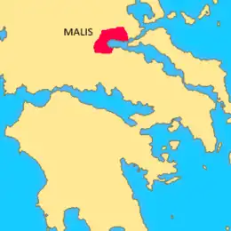 The Malians (Ancient Greek: Μαλιεῖς, Malieis) were a Greek tribe that resided at the mouth of the river Spercheios in Greece. The Malian Gulf is named after them. In the western valley of the Spercheios, their land was adjacent to the Aenianes. Their main town was Trachis. In the town of Anthele, the Malians had an important temple of Demeter; an early centre of the Delphinian Amphictiony.[1] According to Herodotus, the Malian Ephialtes of Trachis betrayed the Spartans and their allies in the Battle of Thermopylae, helping the Persians surround the Greek army. In 426 BCE, the Malians asked Sparta for help in their war against the Oetaeans. The Spartans then founded the town Heraclea Trachis in place of Trachis.