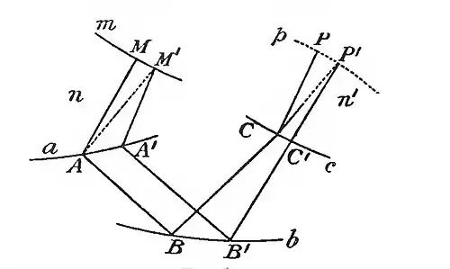 Pass the pencil of rays through an arbitrary system of reflecting and refracting material. For illustration, consider two rays refracted at points A and A'; reflected at points B and B'; and refracted points C and C'.