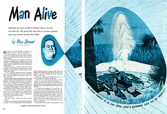 "Man Alive" is a Nero Wolfe mystery novella by Rex Stout, first published in the December 1947 issue of The American Magazine. It first appeared in book form in the short-story collection Three Doors to Death, published by the Viking Press in 1950.