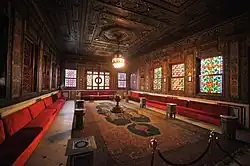 The Mosque: The Mosque within the Manial Palace complex was constructed in the Ottoman architectural style and is regarded as one of the most architecturally and artistically distinguished structures in the palace. The mosque consists of two iwans (halls).The Levantine Hall in the Reception SerailThe eastern iwan features a ceiling designed with small domes made of yellow glass, while the western iwan is adorned with decorations resembling the rays of the sun. The minbar (pulpit) and mihrab (prayer niche) are gilded, enhancing their visual prominence. The walls are covered with Iznik tiles, some of which bear inscriptions.