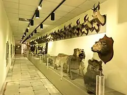 The Hunting Museum: The Hunting Museum was added to the palace in 1963, utilizing a long corridor along the northern wall, transforming it into a dedicated space for hunting artifacts. The museum displays a collection of 1,180 specimens of taxidermied animals, birds, and butterflies from the hunting collections of King Farouk, Prince Muhammad Ali, and Prince Yusuf Kamal. Additionally, the museum features the skeletons of a camel and a horse, which were used to carry the Kabah cover during the Mahmal procession, as well as skulls, horns, skins, hunting tools, and paintings.
