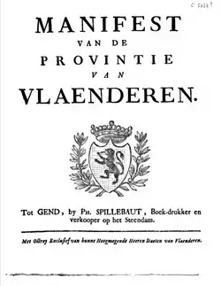 The Manifesto of the Province of Flanders (1790 Dutch: Manifest van de Provintie van Vlaenderen; modern Dutch: Manifest van de Provincie Vlaanderen) was the declaration of independence of the county of Flanders on 4 January 1790, during the Brabantine Revolution. On this day, the States of Flanders "solemnly declare[d] in the name of the People, the province of Flanders to be an independent State, and definitively withdrawn from its loyalty and obedience to emperor Joseph II, count of Flanders, and from the House of Austria."[1] The States also declared "all officials, lieges and other servants, whoever they may be, free and absolved from all concluded and indebted contracts, and discharged from every oath done to the fallen count of Flanders."[2]