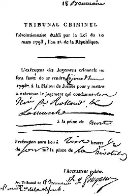 - ^ It is not clear whether Madame Roland was called as a witness during the trial against the Girondins. She was present in the building where the trial took place. However, the judge ruled at a certain point that the case had been going on long enough "because the accused had already been found guilty by the people."