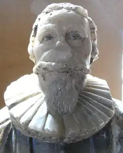 Philip III Courtenay (1547–1611) (son by first wife Dorothy Pollard), married Joane Boyes (died 1586), daughter of John Boyes of Kent. One of their daughters, Lydia, married Richard Culme in Molland Church. Their daughter Elizabeth Courtenay (died 1624) married in 1600[56] to the Hollander Peter Muden, a doctor of medicine, of Butterleigh, three miles south-east of Tiverton. Muden reconstructed Butterleigh parish church[57] and later erected in it a mural monument to his wife which included a female effigy between two children with verse,[58] of which only one fragment survives, a small alabaster statue of a kneeling man.