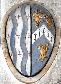 - ^ Rogers: "apparently a bend charged with three mullets", p.384; the bend may have been on a bend three cross crosslets fitchy, the arms of Wonwell (see: Benson, J., Molland, Devon and Cornwall Notes and Queries, Vol. 25 (1952-53), pp.101-102). Image see w:File:Courtenay Quartering ABend MollandChurch Devon.jpg