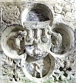 Rogers described as "seemingly portions of a raised tomb"[32] fragments[33] of sculpted stone decorated with gothic quatrefoils and heraldic shields, which stand in Molland Church. These form a small box-like object now situated railed-off on the floor against the east wall of the north aisle under the mural monument to John Courtenay (died 1732). This object was referred to by W.G. Hoskins as "a curious double heart-stone...a receptacle for the hearts of a Courtenay and his wife".[34] The escutcheons show the arms of Courtenay alone and quartering a bend, on which in 1877 were visible three indistinct charges.[35] One escutcheon of Courtenay is supported by two dolphins.[36]