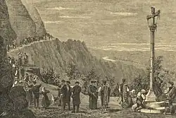 In the 1880s Solferino was extremely active in pilgrimage activities, many of them also marked with Nocedalista political undertones; as organizer he appeared hand-in-hand with iconic Integrist figures like Félix Sardá y Salvany.[37] Though re-launch of the aborted 1882 visit to Rome, attempted as late as 1885, did not work out, Solferino was arranging smaller-scale pilgrimages to Catalan sanctuaries like in 1886 to Montserrat[38] or to foreign ones like in 1887 to Lourdes;[39] in 1887 he was formally appointed member of the bishop commission, entrusted with co-ordination of pilgrimage activities.[40] Already in 1877 listed as member of Junta Directiva of the Barcelona branch of Juventud Católica,[41] in the mid-1880s he grew to Catalan presidency of the organization.[42] Hosting bishops in his private residence,[43] he donated money to Catholic initiatives.[44] Listed as active in clearly Carlist enterprises like erecting monument to Zumalacarregui (in 1883)[45] or commemorating fallen Carlists (in 1888)[46] he was acknowledged as organizer also by civil administration: in 1887 mayor of Barcelona appointed him to commission coordinating charity activities.[47]