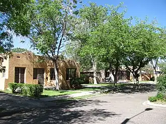 The Manzano Court Addition Historic District is a historic district in the Downtown Neighborhood of Albuquerque, New Mexico. It encompasses the entirety of the Manzano Court Addition, a small subdivision consisting of a one-block-long cul-de-sac and twelve surrounding houses, eight of which are contributing properties. The subdivision was platted in 1923 by Anna Swetland Gotshall (1892–1985),[2] an Ohio native who came to Albuquerque for tuberculosis treatment. Gotshall also designed and built the subdivision's first eight houses between 1925 and 1928. Four additional houses were completed later.[3] The district was added to the New Mexico State Register of Cultural Properties in 2003 and the National Register of Historic Places in 2004.[1]