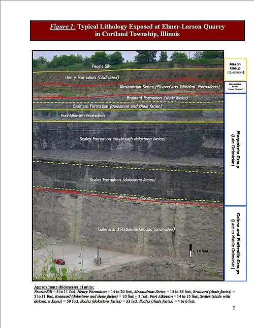 In Illinois, the basal formation is called the Scales Formation and consists mainly of dark brown and gray dolomitic shale. In north central Illinois, the bottom half is dominantly a yellowish gray coarse crystalline dolomite (rock form of the mineral dolomite which is related to calcite). It does not contain many fossils, although large trilobites and large cephalopods are known from Elmer-Lason Quarry. It is typically 75 to 100 feet thick. It is the only formation of the Maquoketa Group that is not exposed in northeastern Illinois.