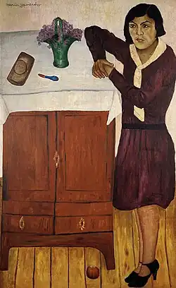 Classified by some as a surrealist painter, María Izquierdo never identified herself as a surrealist. Instead, Izquierdo identified with the Contemporáneos, who believed that Mexican culture should be rightfully seen as a vital contributor to the dominant Western culture. She wasn't afraid to go against popular Mexican art movements and follow her own style of painting. Her culture as a mestiza was an essential part of her artistic style and themes used in her work.[7] Izquierdo was celebrated as an artist with a genuine understanding of native and rural traditions, and her altar paintings were recognized at the time for "their delightful indigenous ingenuousness."[13] Her naive painterly technique, intended to recall the folk painting of regional artisans, heightened the effect.[13] Still, many of her paintings contain unusual subject matters and interesting juxtapositions.[13] Izquierdo's peculiar inclusion into a Mexican nationalist discourse suggest ways of bringing together several sets of discourses too often kept separate: those of Latin America, of feminism, of modernism, and of nationalism.[13] Still, many of her paintings contain unusual subject matters and interesting juxtapositions. Known for her use of bold, rich, and bright colors, most of Izquierdo's paintings were done using oil paints or watercolor.[3] Although she was and is still often compared to Frida Kahlo because both woman launched their careers at similar times, the two have very individual styles. At the beginning she would paint still life and portraits. She experimented with many different styles and techniques; such as, oil painting, watercolor, still life, and landscape.[14]