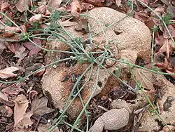 The anthropomorphic common names "manroot" and "old man in the ground" derive from the swollen lobes and arm-like extensions of the unearthed tuber. On old plants, the tuber can be several meters long and weigh in excess of 100 kg (220 lb).