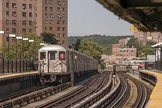 The city government took over the IRT's operations on June 12, 1940.[9][10] Platforms at IRT Broadway–Seventh Avenue Line stations between 103rd Street and 238th Street, including those at 225th Street, were lengthened to 514 feet (157 m) between 1946 and 1948, allowing full ten-car express trains to stop at these stations.[7] A contract for the platform extensions at 225th Street and five other stations on the line was awarded to the Rao Electrical Equipment Company and the Kaplan Electric Company in June 1946.[11] The platform extensions at these stations were opened in stages. On July 9, 1948, the platform extensions at stations between 207th Street and 238th Street, including the 225th Street station, were opened for use at the cost of $423,000.[7][12] At the same time, the IRT routes were given numbered designations with the introduction of "R-type" rolling stock, which contained rollsigns with numbered designations for each service.[13] The route to 242nd Street became known as the 1.[14]