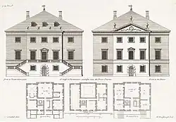 Pembroke, then Lord Herbert, based the design of Marble Hill to a large degree on Andrea Palladio's 1553 Villa Cornaro in Piombino Dese, Italy, and thus incorporated a cubic saloon on the first floor or piano nobile.[4] Villa Cornaro also served as a model for plantation houses in the American colonies, examples being Drayton Hall (1738–1742) in Charleston, South Carolina, and Thomas Jefferson's initial version of Monticello (1768–1770). It was in other respects an adaptation of a more expansive design by Colen Campbell. It is set in 66 acres (2.67 km2) of parkland known as Marble Hill Park. The Great Room contains lavishly gilded decoration and five capricci paintings by Giovanni Paolo Pannini. Marble Hill House also contains a loaned collection of early Georgian furniture and paintings as well as the Chinoiserie collection of the Lazenby Bequest.[5]