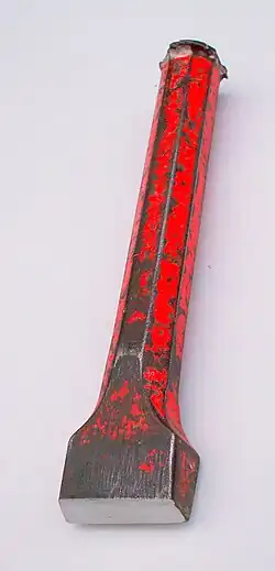 Sculptors usually begin by knocking off, or "pitching," large portions of unwanted stone. A suitable tool for this task is a point chisel, which is a long, hefty piece of steel with a point at one end and a broad striking surface at the other. A pitching tool may also be used at this early stage, which is a wedge-shaped chisel with a broad, flat edge. The pitching tool is useful for splitting the stone and removing large, unwanted chunks.