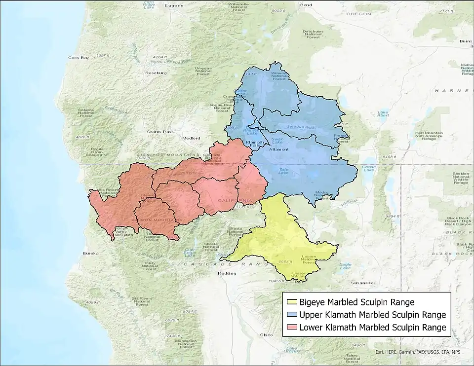 Moyle states that the lower Klamath marbled sculpin occurs in the mainstem Klamath River and its tributaries from the Trinity River confluence up to Iron Gate Dam, and that the upper Klamath marbled sculpin inhabits the watershed upstream of Klamath Falls.[2] However, it is likely that this species has also been present in tributaries to the Klamath River between Iron Gate Dam and Klamath Falls. With the removal of four Klamath dams in 2024, populations downstream of the Iron Gate Dam site will now be connected to further upstream populations for the first time since 1918.[4] Surveys of the Lost River watershed in the upper Klamath basin found marbled sculpin to only be occupying a few small headwater streams.[2] Bigeye marbled sculpin are found in the lower Pit River watershed, including tributaries such as Hat Creek, Burney Creek and the Fall River.[5]