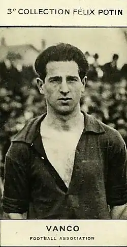 Vanco stayed loyal to the club for five years, from 1918 to 1923, when he decided to move to RC Roubaix, where he retired in 1928, aged 33,[3] as one of the oldest players in Marseille football at the time.[8] While there, he played alongside the likes of Georges Verriest, Raymond Wattine, and Raymond Dubly.[12]