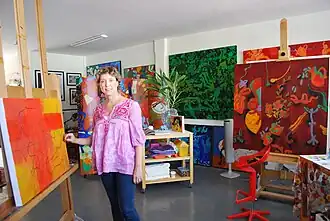 In 1991, she moved back to her hometown of Mexico City. She took classes in painting and began her habit of painting eight hours a day, which continues to this day.[2] However, she also worked at an etching workshop with notable masters of the craft such as José Luis Cuevas, Manuel Felguérez and Carmen Parra.[3] In addition to creating her own work she has worked on collaborative projects in places such as the Centro Cultural Arte Contemporáneo, the workshop of Mercedes Escobar in Mexico City and the Alfartía Traditional workshop of Gorky González of Guanajuato.[1] One notable collaborative relationship is with Uriarte Talavera, with her most recent work with them as a participant in the El Cinco de Mayo de 1862 exhibition, honoring the 150th anniversary of the Battle of Puebla.[5][6]