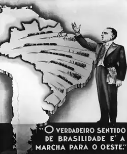 The March to the West (Portuguese: Marcha para o Oeste) was a public policy engendered by the government of Getúlio Vargas during the Estado Novo (1937–1945) in order to develop and integrate the Center-West and North regions of Brazil, which until that moment had a low population density, quite different from what occurred in the Brazilian coastal region.[1] At the beginning of the 1940s, practically all of the country's 43 million inhabitants were concentrated along the coast and saw the interior of their own country as something exotic. The region was nothing more than a huge and unexplored spot in Brazilian geography.[2]