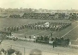 In the United States, modern marching bands are often associated with American football games, with the oldest (the University of Notre Dame Band of the Fighting Irish) first performing at an American football game in 1887.[8] After World War I, the presence and quality of marching bands in the American public school system expanded as military veterans with service band experience began to accept music teaching positions within schools with developments such as Precision Drill, a disciplined geometric march, based in part on military-style drill. Today, marching band competitions remain popular in the United States[9] and largely parallel modern drum and bugle corps.