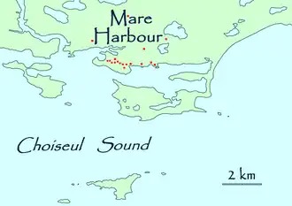 Mare Harbour, known colloquially as East Cove Port, is a small settlement on East Falkland, on Choiseul Sound. It is mostly used as a port facility and depot for RAF Mount Pleasant,[1] as well as a deepwater port used by the Royal Navy ships patrolling the South Atlantic and Antarctica, which means that the main harbour of the islands, Stanley Harbour, tends to deal with commercial transport.