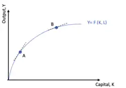 Graphically, this evidence can be observed by the curve shown on the graphic, which represents the effect of capital, K, on the output, Y. If the quantity of labor input, L, is hold fixed, the slope of the curve at any point resemble the marginal product of capital. In a low quantity of capital, such as point A, the slope is steeper than in point B, due to diminishing returns of capital. By other words, the additional unit of capital has diminishing productivity, once the increase on production becomes less and less significant, as K rises.[4]