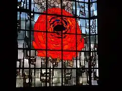 Böhm also designed the large windows, such as the green Schlangenfenster (Snake Window)[3] and the red Rosenfenster (Rose Window), the rose being a repeated motif throughout the building.[8] The Mariensäule (Mary's Column) holding the image of Mary, the altar and a high tabernacle housing the Eucharist were designed by Elmar Hillebrand, a sculptor from Cologne.[8]