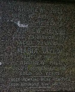 Hill and her husband had two children, Jessie & Margaret Lindsey Hill. Andrew Hill died in 1830. Hill then married Andrew Taylor, a Sergeant from the 100th Foot. They lived the remainder of their lives in Richmond, Upper Canada. Andrew Taylor died 29 March 1879, aged 79 years and Maria Woods Hill Taylor died 11 September 1881, aged 90 years. She left her estate to the St. John's Anglican Church in Richmond for a new church spire.[3]: 45 Maria and both husbands were eventually interred at the National Beechwood Cemetery in Ottawa in the family plot of Edward Malloch II her son-in-law.