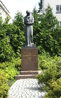 On 5 September 1935, a monument to Maria Skłodowska-Curie was unveiled in the park. She was a 19th- and 20th-century physicist and chemist who conducted pioneering research on radioactivity, and the first woman to win a Nobel Prize, as well as the first person to win a Nobel Prize twice. The bronze statue was commissioned by Stefan Starzyński, the mayor of Warsaw, and designed by sculptor Ludwika Nitschowa.[3][4] The monument was damaged during the Warsaw Uprising in the Second World War, when it was used by soldiers of the Russian People's Liberation Army, a Russian collaborationist formation off the Protection Squadron, as a practice target.[3][5] It was renovated in 1997, however the bullet holes were left in, as a reminder of the conflict.[3]