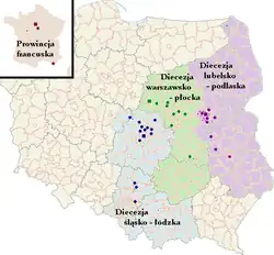 organized into three dioceses in Poland with 38 parishes and one province in France with 2 parishes: