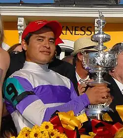 Mario Gutierrez (Spanish pronunciation: [ˈmaɾjo ɣuˈtjeres];[1] born c. 1987) is a Mexican Thoroughbred horse racing jockey who won the 2012 Santa Anita Derby, Kentucky Derby and Preakness Stakes aboard I'll Have Another, a colt owned by Windsor, Ontario, native J. Paul Reddam and his wife, Zillah.[2][3] He also won the 2016 Kentucky Derby aboard Nyquist, also owned by Reddam and trained by Doug O'Neill.