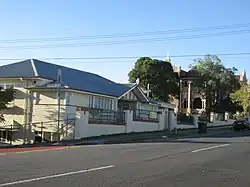 Adjacent to the school are a number of Catholic buildings still owned by the Parish. At 369 Given Terrace stands the large red brick Sacred Heart Church, built in 1917. Immediately across the road at 333 Given Terrace is the "Sacred Heart Primary School" (consisting of 5 small buildings) for grades 1–7, now closed but used by other Catholic groups. Behind that is a brick community hall constructed in 1978. There is also a parish priest residence on Given Terrace and a smaller building on the corner of Fernberg Road and Given Terrace that stands where the parish’s original wooden church stood. The original wooden church was constructed and formally blessed by Archbishop Robert Dunne on 10 March 1907 and was used until the large brick church was built in 1917, and thereafter it was used for primary school schooling until it burnt down in the 1970s. Finally at 327 Given Terrace there is the Sacred Heart Convent built in 1918 which was owned and used by the Sisters of Mercy order of nuns (who had commenced teaching in the parish in 1905) until sold by them in 2005.