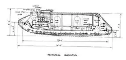 As there was no time for a completely new design, the Mark IX was based on the Mark V, with the hull lengthened to 9.73 m (31 ft 11 in). The 150 hp Ricardo engine was moved to the front, the gearbox to the back and the suspension girders left out entirely. This created an inner space 4 m (13 ft 1 in) long and 2.45 m (8 ft 0 in) wide, enough room for thirty (officially even fifty) soldiers or ten tons of cargo. To ensure sufficient stiffness for the chassis, the floor was reinforced by heavy transverse girders. The infantry inside had to contend with the control rods for the gears running along the roof and the drive shaft through the middle. Unfortunately for the infantrymen, no seats were built in for them in the tank.[4]