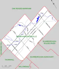 Markham—Unionville is located in the City of Markham within an area bordered by a line commencing at the Highway 404-407 interchange, then east along Highway 407 to McCowan Road, north on McCowan Road to Bur Oak Road, east on Bur Oak to Highway 48, then to the northern city limit, then along the northern and western city boundaries to the 404-407 interchange.[3]