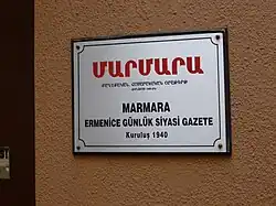 Marmara (Armenian: Մարմարա) (sometimes "Nor Marmara" - New Marmara) is an Armenian-language daily newspaper published since August 31 1940 in Istanbul, Turkey. It was established by Armenian journalist and foreign correspondent Souren Shamlian. Initially a weekly newspaper, it was soon published daily due to intense interest. Following Shamlian's death in 1951 his daughter and her husband, Seta and Bedros Zobyan, took over the paper. When the Zobyans left Istanbul for Canada in 1967, they left the paper to Rober Haddeciyan (also known as Robert Haddeler), a writer and journalist who was already working for the paper.
