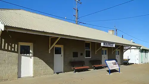 The former Marree railway station building, with an explanatory sign outside, in 2013 | ||||||||||||||||