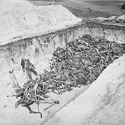 ![]() ![]() ![]() ![]() ![]() ![]() ![]() From above. 1st row: Mass graves of Bergen-Belsen after its liberation in April 1945. 2nd row: Jewish prisoners from Hungary newly arrived at Auschwitz in May 1944; left image, chimneys of crematoriums II and III of Birkenau. 3rd row: corpses in April 1945 in the already liberated Nordhausen concentration camp (left). Crematory ovens in Buchenwald with bones of German women opposed to the Nazis, April 1945 (right). 4th and last row: Auschwitz | |