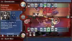 Marvel Trading Card Game is a collectible card game with similarities to other card games, like Magic: The Gathering.[1] The game was designed to portray the VS System rules exactly the same as the physical version,[2] created by baseball card manufacturer Upper Deck Entertainment.[3] Players start each match with a premade deck of cards,[1] from which they draw a number of cards to form a hand. Cards in the hand can be subsequently put into play, and each card represents a character or ability that is played against similar cards possessed by the opponent.[4]